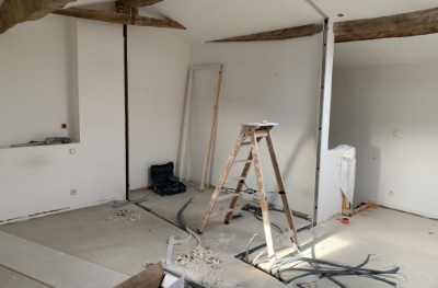 Redistribution des pièces du 1er étage (sdb/dressing/chambre) avec la pose d’une cloison type verrière en acier, afin d’isoler phoniquement la partie nuit de la partie jour au rez-de-chaussée.